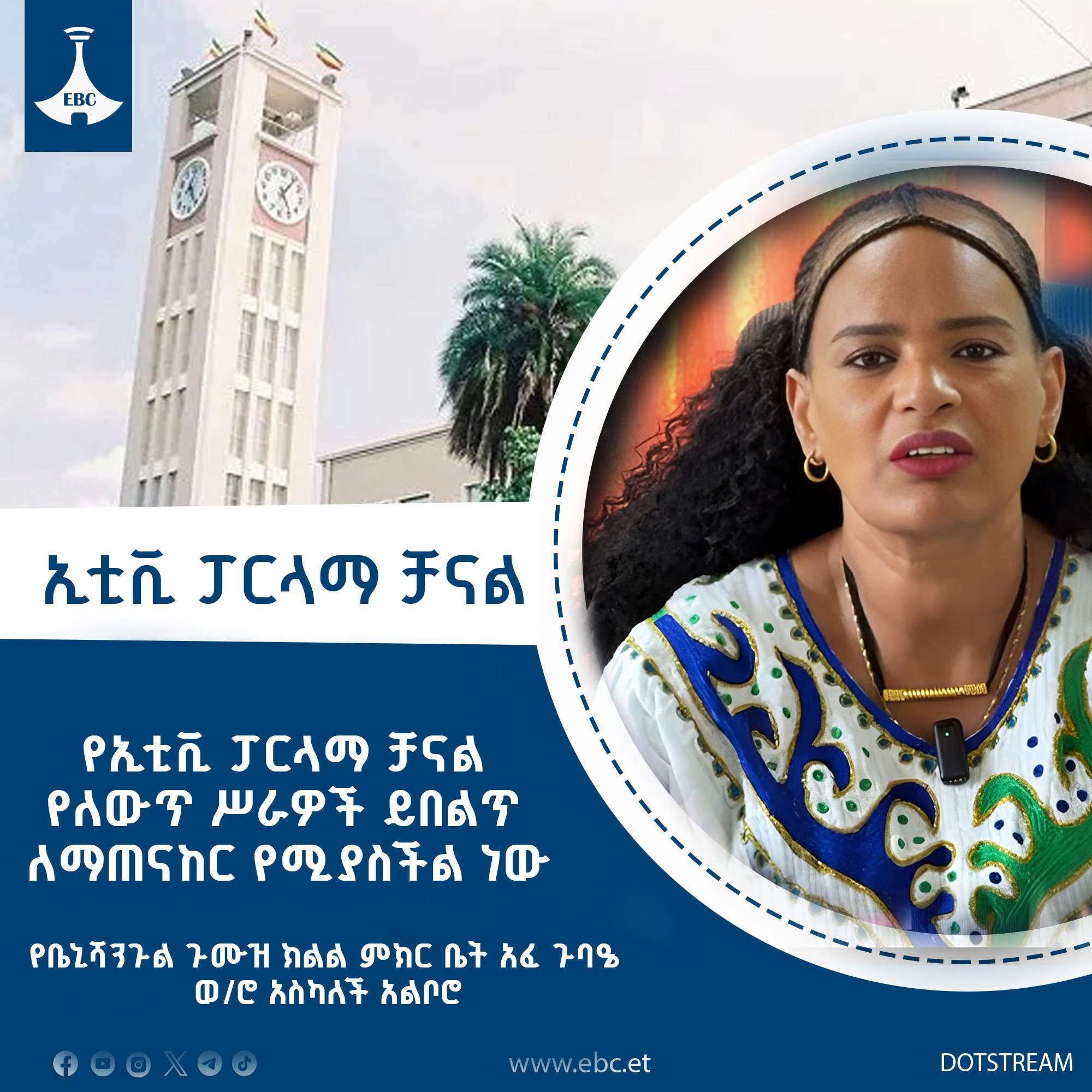 የኢቲቪ ፓርላማ ቻናል ለሕዝብ አማራጭ መረጃን ይዞ የመጣ መሆኑን የቤኒሻንጉል ጉሙዝ ክልል ምክር ቤት አፈ ጉባዔ ወ/ሮ አስካለች አልቦሮ ገለፁ።