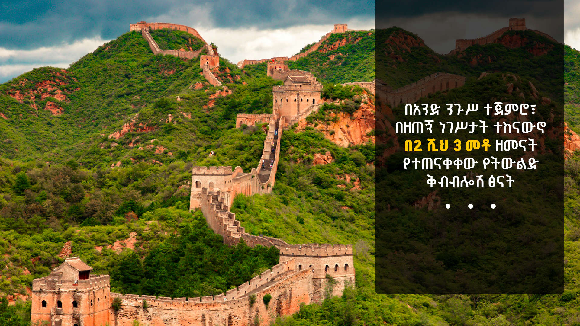 ዘመናዊ የምህንድስና መሳሪዎች ባልተፈጠሩበት ከዛሬ 2 ሺህ 700 ዓመታት በፊት የተገነባው የቻይና ግንብ የምድር ወገብን ግማሽ የሚያህል ማለትም ከ21 ሺህ ኪሎ ሜትር በላይ ርዝመት አለው።