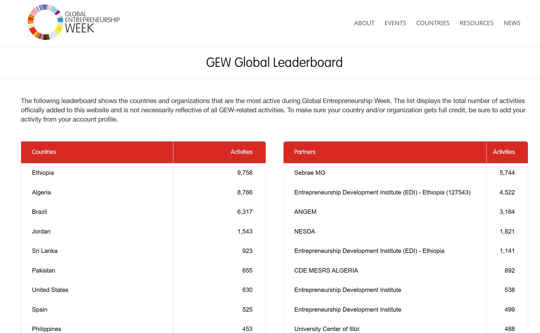 ዓለም አቀፉ የኢንተርፕረነርሺፕ ኔትወርክ (GEN) በየጊዜው በሚያወጣው የኢንተርፕረነርሺፕ ሳምንት (GEW) ደረጃ መሠረት ኢትዮጵያ ለኢንተርፕረነርሺፕ አስቻይ ሁኔታን ለመፍጠር በመሥራት ረገድ ለሳምንታት በዓለም አቀፍ ደረጃ የቀዳሚነቱን ሥፍራ ይዛ መቀጠሏን የኢትዮጵያ ኢንተርፕረነርሺፕ ልማት ኢንስቲትዩት (EDI) አስታወቀ።