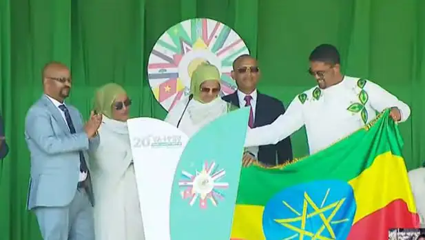 የማዕከላዊ ኢትዮጵያ ክልል ርዕሰ መስተዳድር እንዳሻው ጣሰው (ዶ/ር) የዝግጅቱን ሰንደቅ ዓላማ ለኦሮሚያ ክልል ርዕሰ መስተዳድር አቶ ሽመልስ አብዲሳ አስረክበዋል፡፡