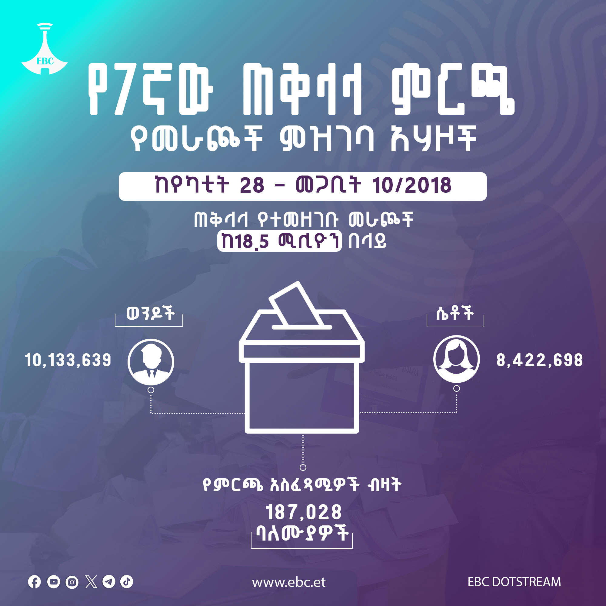ሰባተኛው ጠቅላላ ምርጫ በአሃዝ ማክሰኞ መጋቢት 15, 2018 72 አስተያየትዎን እዚህ ያስፍሩ: Send ተያያዥ ዜናዎች: አምስቱ አቅሞች ሓሙስ ሚያዝያ 08, 2018 "ከምንጊዜውም በላይ ታላቅ የምንሆንበት ጊዜ ሩቅ አይደለም!" - ጠቅላይ ሚኒስትር ዐቢይ አሕመድ (ዶ/ር) ሓሙስ ሚያዝያ 08, 2018 የኢትዮጵያ መንገዶች ባለፉት 8 ዓመታት ሓሙስ ሚያዝያ 01, 2018 ሰሞነኛ ጂኦ ፖለቲካዊ ለውጦችና የኢትዮጵያ መንገድ ሓሙስ ሚያዝያ 01, 2018