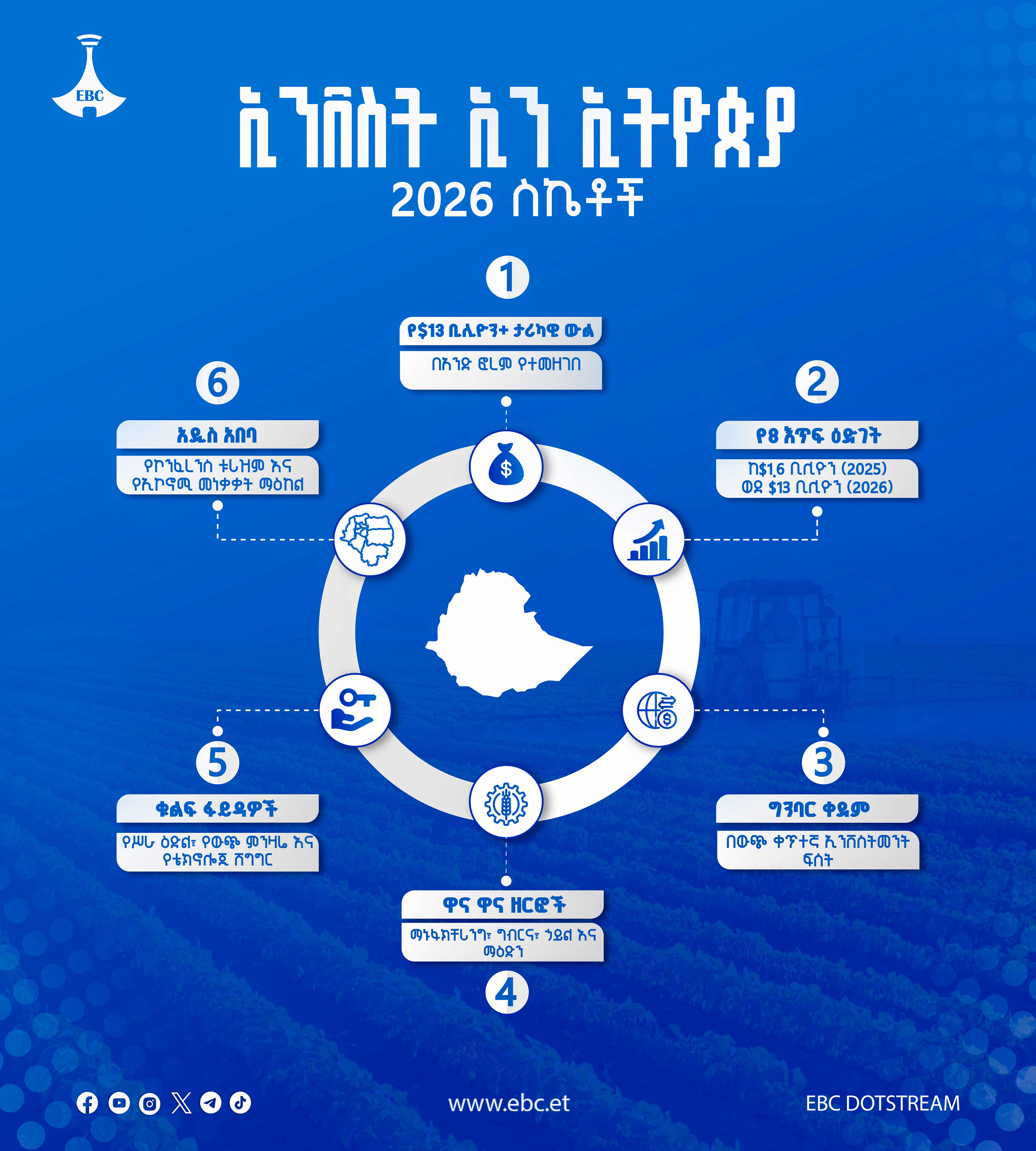 የ"ኢንቨስት ኢን ኢትዮጵያ 2026" ታሪካዊ ስኬቶች በቁጥር ቅዳሜ መጋቢት 19, 2018 69 አስተያየትዎን እዚህ ያስፍሩ: Send ተያያዥ ዜናዎች: 7ኛው ጠቅላል ምጫ እና የሚዲያ ድልድል ቅዳሜ መጋቢት 19, 2018 የኢትዮጵያ ባንክና የፋይናንስ ሽግግር ቅዳሜ መጋቢት 19, 2018 ዓለም አቀፉ የኢነርጂ ቀውስ እና የነዳጅ ፍጆታን ለመቀነስ የቀረቡ 10 አማራጭ መፍትሔዎች ሓሙስ መጋቢት 17, 2018 የኢትዮጵያ ግብርና አዲስ ምዕራፍ፦ ከልማዳዊ እርሻ ወደ ዘመናዊ ምርታማነት ሓሙስ መጋቢት 17, 2018