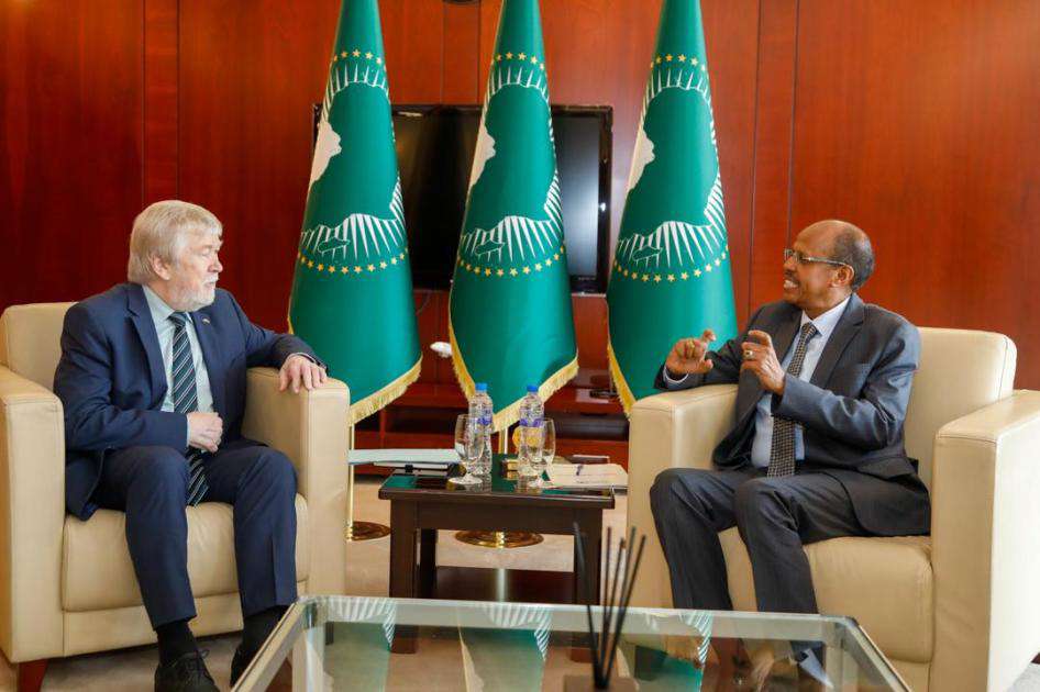 The Chairperson of the African Union Commission, Mahmoud Ali Youssouf, held a meeting with Evgeny Terekhin, the Russian Ambassador to Ethiopia and Representative to the AU, to discuss strengthening cooperation between the two partners. Their conversation centered on AU–Russia cooperation and the ongoing preparations for the 2nd Ministerial Conference of the Russia–Africa Partnership Forum.